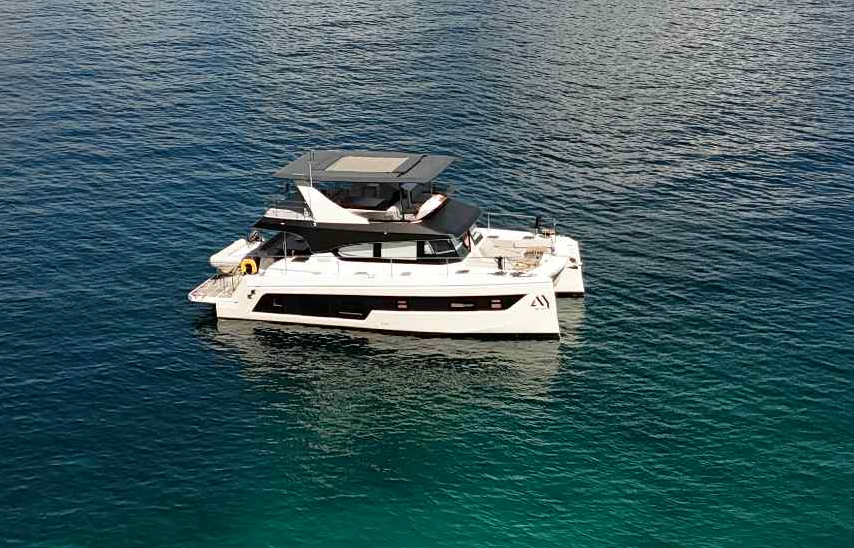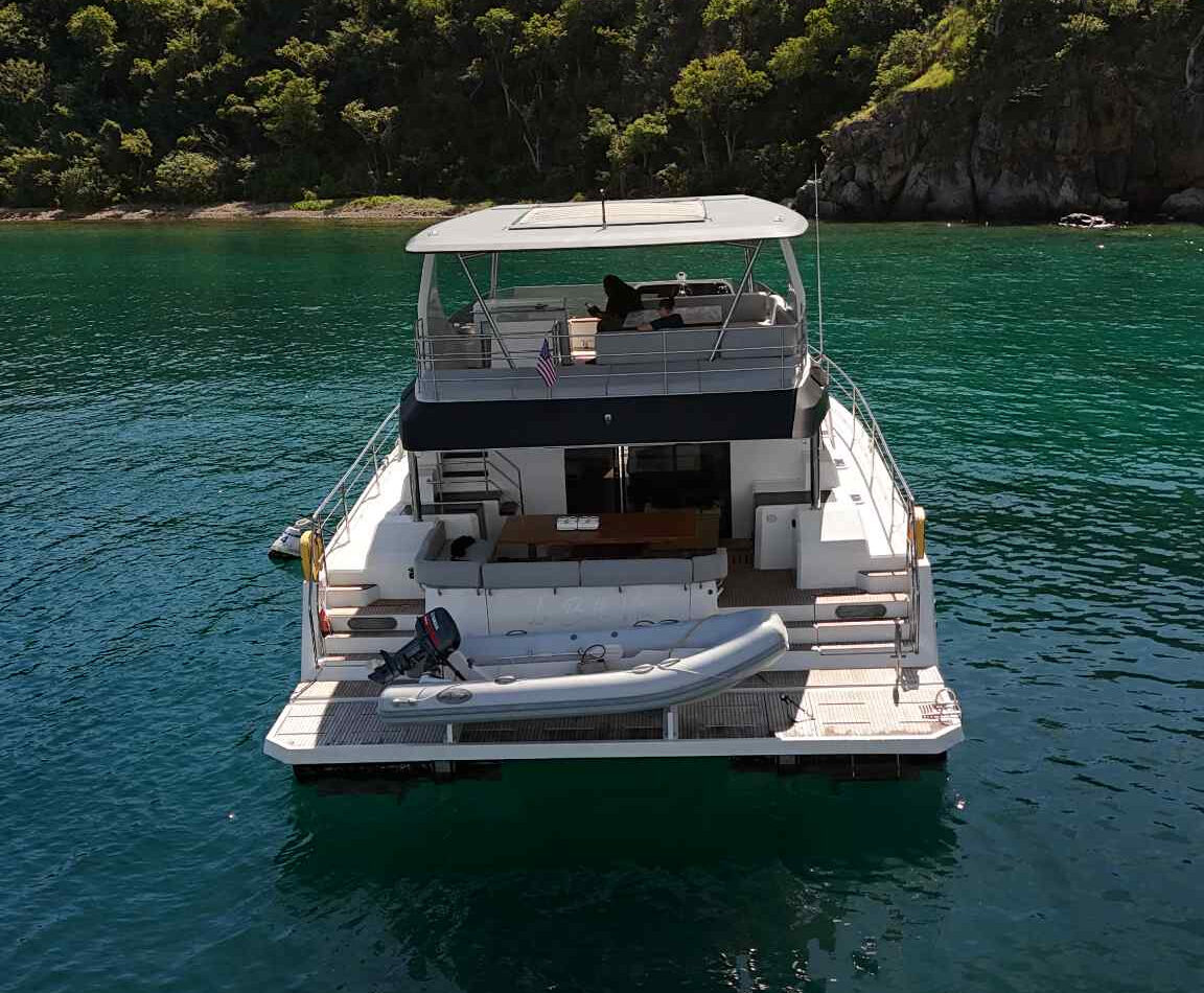 The Aventura 50 is equipped with Yanmar 440 engines with a bow thruster to make operation a breeze. The powercat is also equipped with the most popular features, specifically designed and requested by our charter guests including: full-beam hydraulic swim platform, watermaker, ice maker, full-size refrigerator/freezer, and a large seating/dining area on the aft deck and the flybridge!