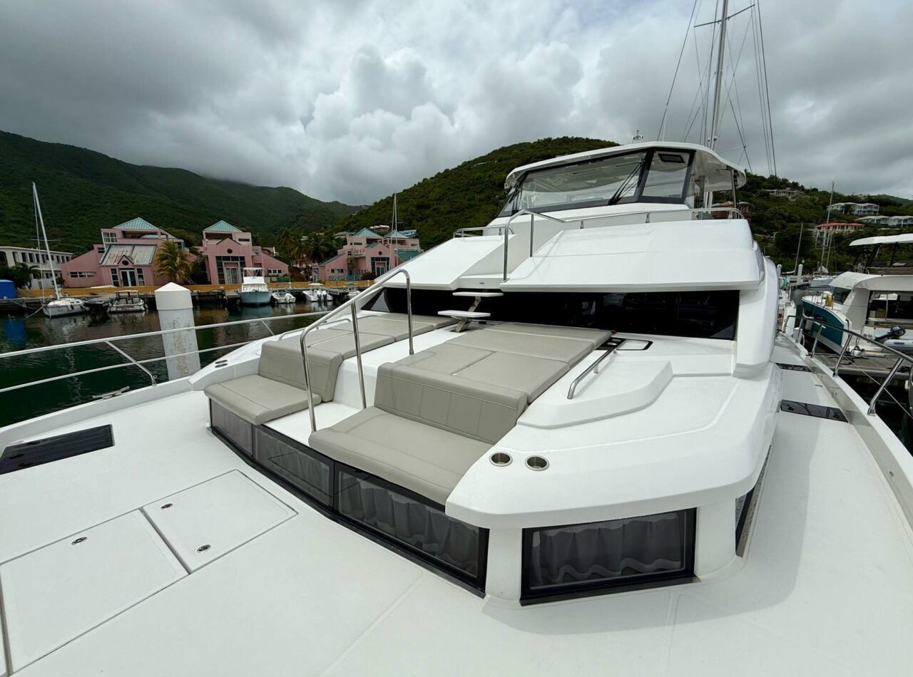 Charter guests aboard the Aquila 54 can enjoy a variety of amenities designed for comfort and entertainment. The flybridge serves as a central hub, featuring an outdoor kitchen with a wet bar equipped with a fridge, ice maker and electric BBQ grill, ideal for alfresco dining and social gatherings. The flybridge is partially enclosed directly in front of the helm, ensuring comfort in varying weather conditions. From the flybridge helm you can easily access the uniquely designed Portuguese bridge deck, and steps forward of the helm lead to two built-in seating areas, perfect for lounging in the BVI sun!