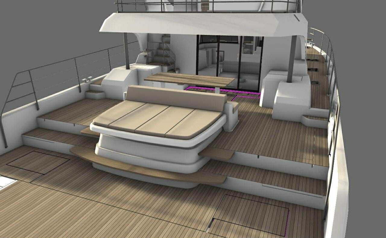 The flybridge on the Aventura 56MY, is huge and offers multiple sunbathing areas and is laid out for comfort and relaxation. The flybridge helm provides the perfect place to navigate your bareboat charter, and there is plenty of seating for your entire charter group to relax next to the captain as you motor from island to island. There is a wet bar on the flybridge, complete with ice maker and grill. The aft deck of ‘Tropically Impaired’ offers an unprecedented amount of space in a newly designed ‘beach club’ layout. With molded seating facing aft and a huge hydraulic swim platform, it is the perfect place for your group to all relax together on charter.
